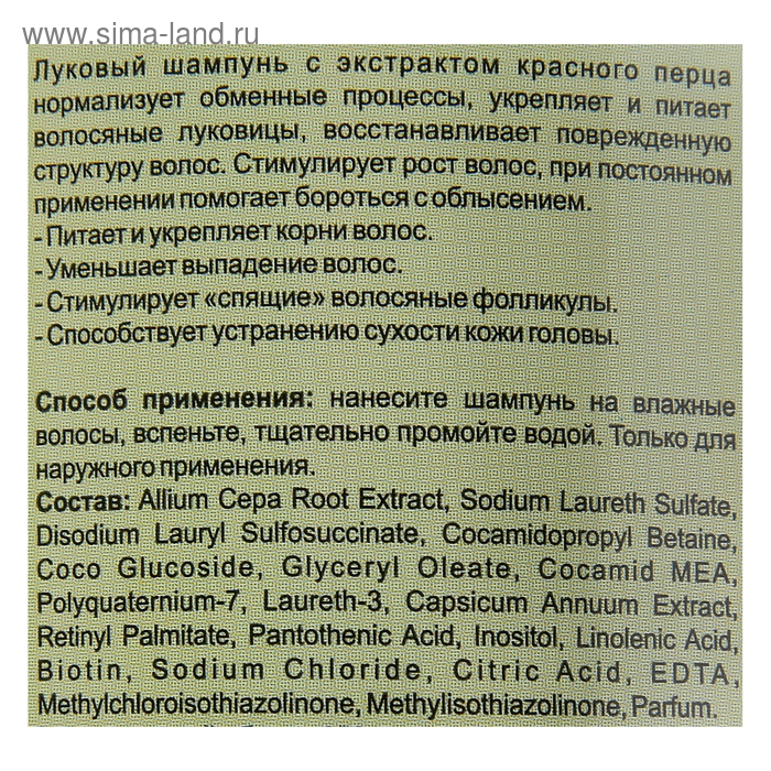 Состав: Allium Cepa Root Extract, Sodium Laureth Sulfate, Disodium Lauryl Sulfosuccinate, Cocamidopropyl Betaine, Coco Glucoside , Glyceryl Oleate, Cocamid MEA, Polyquaternium-7, Laureth-3, Capsicum Annuum Extract, Retinyl Palmitate, Pantothenic Acid, Inositol, Linolenic Acid, Biotin, Sodium Chloride, Citric Acid, EDTA, Methylchloroisothiazolinone, Methylisothiazolinone, Parfum.