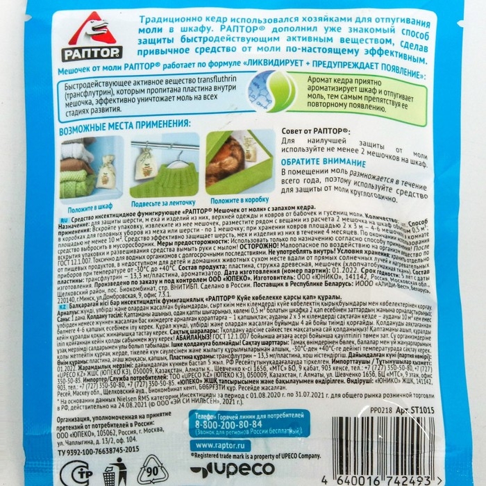 Внутри мешочка от моли РАПТОР® натуральная древесная стружка и пластина, пропитанная активным веществом transfluthrin (трансфлутрин). После вскрытия упаковки активное вещество, начинает постепенно заполнять пространство, смешиваясь с молекулами воздуха. После того, как в шкафу или ящике комода будет набрана нужная его концентрация, наступает уничтожение моли и ее личинок, которые оказались внутри пространства. Приятный аромат кедра ароматизирует шкаф и отпугивает новые особи моли от повторного появления.Transfluthrin (трансфлутрин) – современное быстродействующее вещество, эффективно уничтожит не только бабочек моли, но и ее личинки. Благодаря высокой летучести и проникающей способности трансфлутрин поражает насекомых в 10 раз быстрее, чем любой другой из известных пиретроидов. Инсектицид контактной и ингаляционной активности с быстрым действием против насекомых.Инструкция: Вскройте упаковку, извлеките из нее мешочек от моли РАПТОР. Подвесьте мешочек за веревочку на штангу шкафа или вешалку с одеждой. Используйте 2 мешочка на средний двустворчатый шкаф. Разместите рядом с зимней одеждой из расчета 1 мешочек на ящик шкафа или комода. Мешочек можно использовать для длительного хранения зимних вещей, для этого поместите его в короб для хранения. Важно! Средство будет защищать вашу одежду в течение 4-х месяцев с момента вскрытия упаковки.
