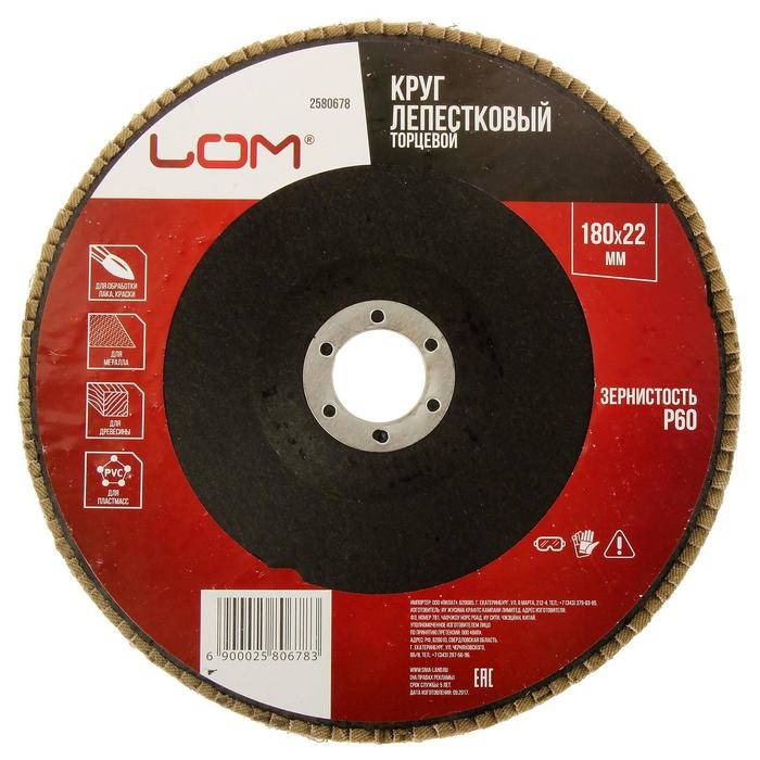 Круг лепестковый торцевой ЛОМ изготовлен из прямоугольных элементов шлифовальной шкурки на тканевой основе, которые расположены в виде веера на подложке из стекловолокна. Применяется в шлифовальных работах по дереву, пластмассе, металлу, и другим материалам.