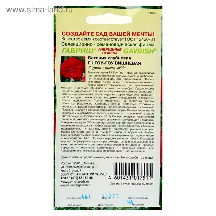 Семена комнатных цветов Бегония "Гоу-гоу", ц/п, вишневая, F1, 4 шт.