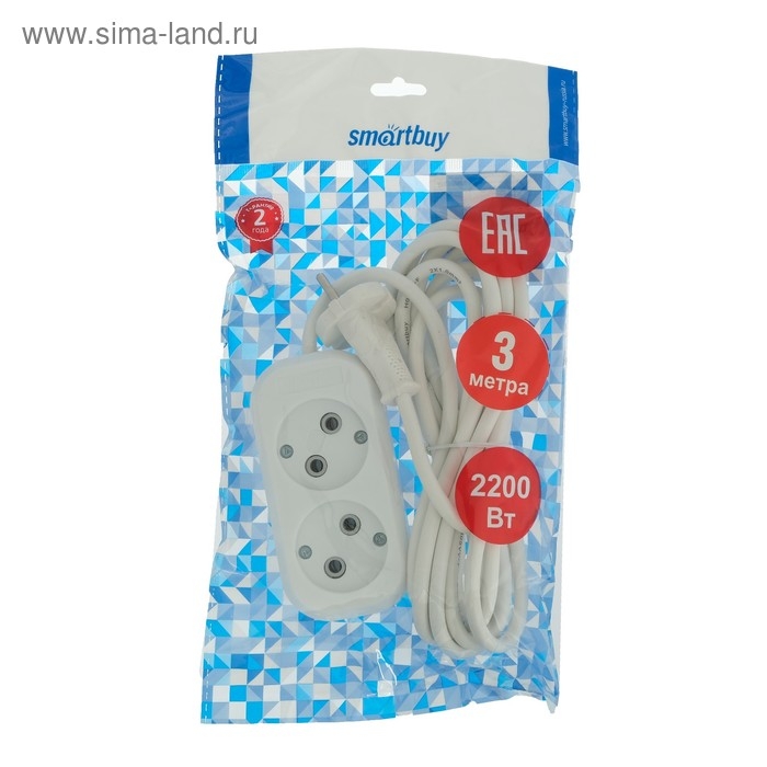 Удлинитель Smartbuy, 2 розетки, 3 м, 10 А, 2200 Вт, ПВС 2х1 мм2, без з/к, белый