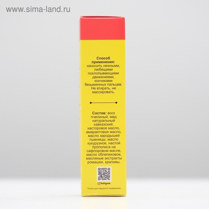 Состав: воск пчелиный, мед, касторовое масло, амарантовое масло, масло зародышей пшеницы, масло кукурузное, масло прополисное, масло облепиховое, масляный экстракт ромашки, масляный экстракт крапивы.