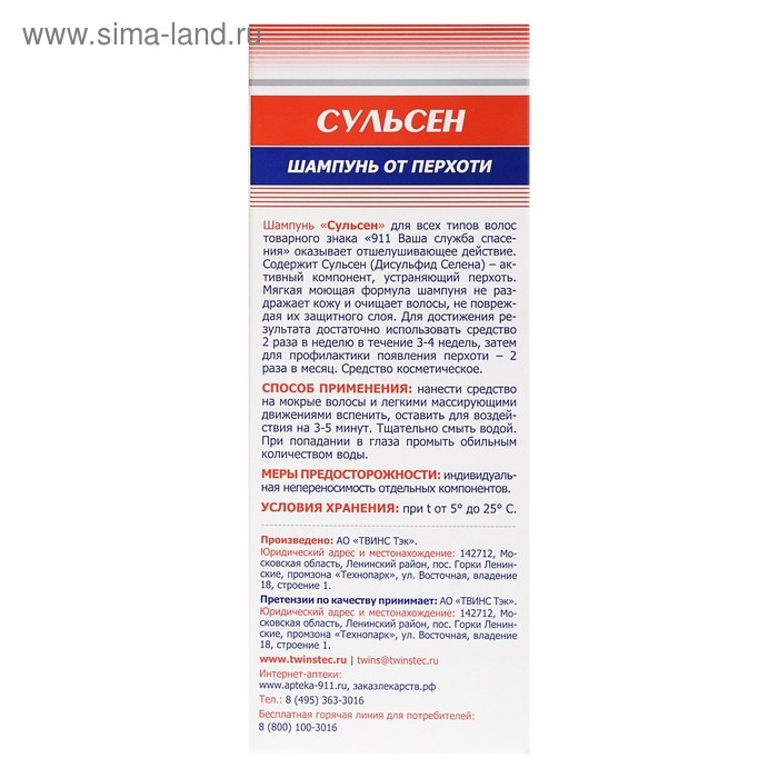 Шампунь «Сульсен» для всех типов волос товарного знака «911 Ваша служба спасения» оказывает отшелушивающее действие. Содержит Сульсен (Дисульфид Селена) – активный компонент, устраняющий перхоть. Мягкая моющая формула шампуня не раздражает кожу и очищает волосы, не повреждая их защитного слоя. Для достижения результата достаточно использовать средство 2 раза в неделю в течение 3-4 недель, затем для профилактики появления перхоти – 2 раза в месяц. Средство косметическое.