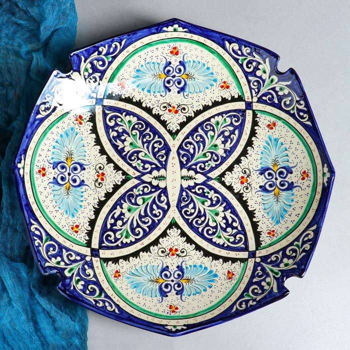 Ляган Риштанская Керамика "Узоры", 40 см, квадратный, рифлёный, синий