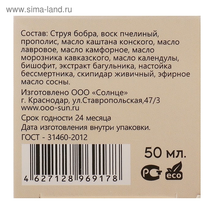 Состав: бобровая струя, пчелиный воск, прополис, масло конского каштана, лавровое масло, камфорное масло, масло морозника кавказского, масло календулы, бишофит, экстракт багульника, настойка бессмертника, живичный скипидар, эфирное масло сосны.