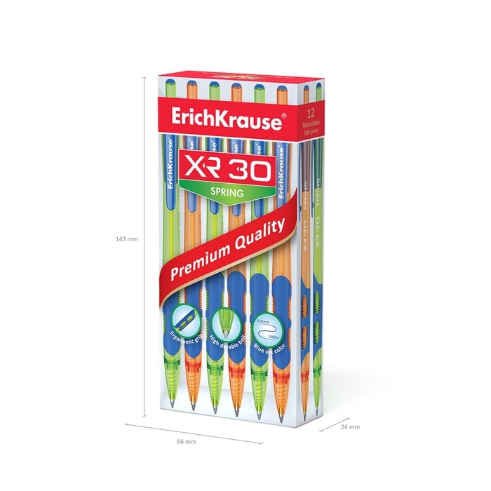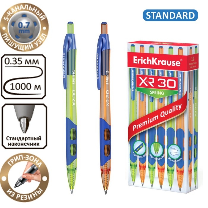 Автоматическая шариковая ручка Matic&Grip со стандартным типом пишущего узла и заменяемым стержнем. Ручка имеет круглый полупрозрачный корпус ярких неоновых цветов с эргономичной комбинированной грип-зоной из резины и профилированного пластика. 5-канальный пишущий узел с диаметром шарика 0.7 мм в сочетании с быстросохнущими чернилами обеспечивает мягкое и быстрое письмо. Длина непрерывной линии составляет 1000 м при толщине 0.35 мм, что является высоким показателем в своей категории. Модель XR-30 Spring стала одним из бестселлеров в ассортименте автоматических ручек ErichKrause®.