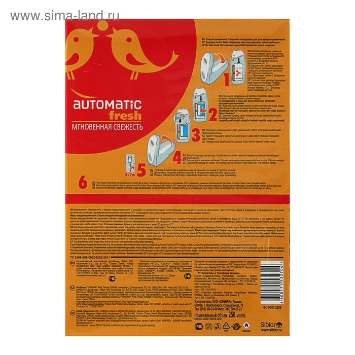 Способ применения: откройте диспенсер, нажав на кнопку в верхней части устройства. Установите регулятор интенсивности. Вставьте 2 батарейки. Поднимите зеленый рычаг внутри устройства вверх, затем вставьте баллон носиком наружу. Установите желаемый интервал распыления, после чего сработает первое распыление. Закройте крышку диспенсера. Установите диспенсер в выбранное место на высоте не менее 2-х метрах пола. При смене баллона не направляя устройство в лицо, поверните регулятор в положение выкл и замените сменный аэрозольный баллон в соответствии с инструкцией выше.