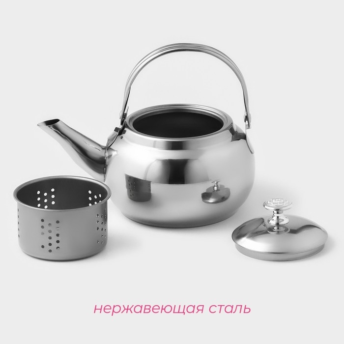 Заварочный чайник изготовлен из высококачественной нержавеющей стали, имеет металлическое сито.