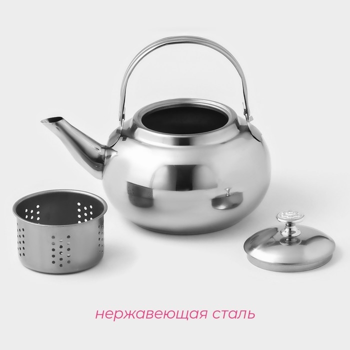 Заварочный чайник изготовлен из высококачественной нержавеющей стали, имеет металлическое сито.
