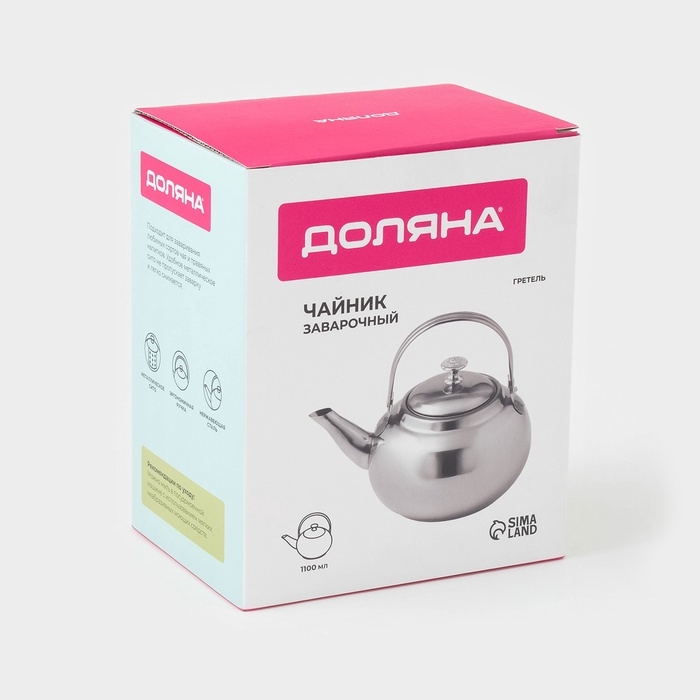 Заварочный чайник Доляна «Гретель», 1,1 л, металлическое сито, нержавеющая сталь, хромированный