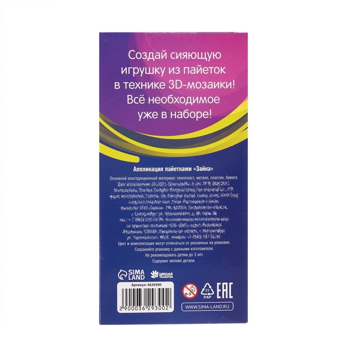 Набор позволит ребёнку смастерить сверкающую игрушку. Малыш с интересом создаст шедевр из ярких пайеток. Ему понравится не только результат работы, но и сам творческий процесс. Увлекательное занятие поможет развить мелкую моторику рук, усидчивость, внимательность и аккуратность.