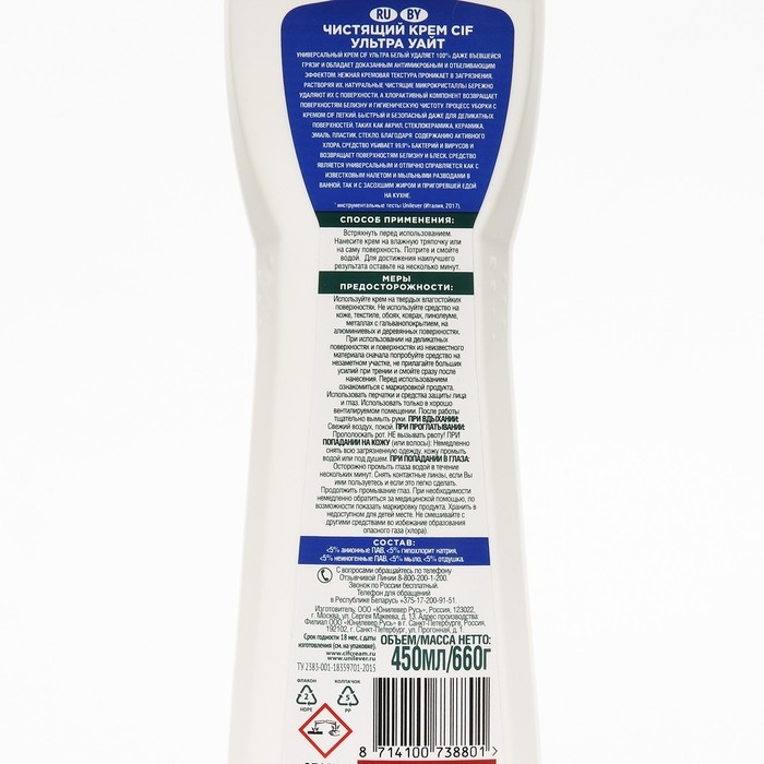 Способ применения: Средство не нужно разводить. Достаточно нанести его тонким слоем на поверхность, потереть губкой или щеткой и оставить на 15-20 минут. Затем аккуратно смыть крем губкой или тряпкой, вытереть насухо. При очистке сильно загрязненных поверхностей препарат рекомендуется оставить на поверхности на 1-2 часа. В случае