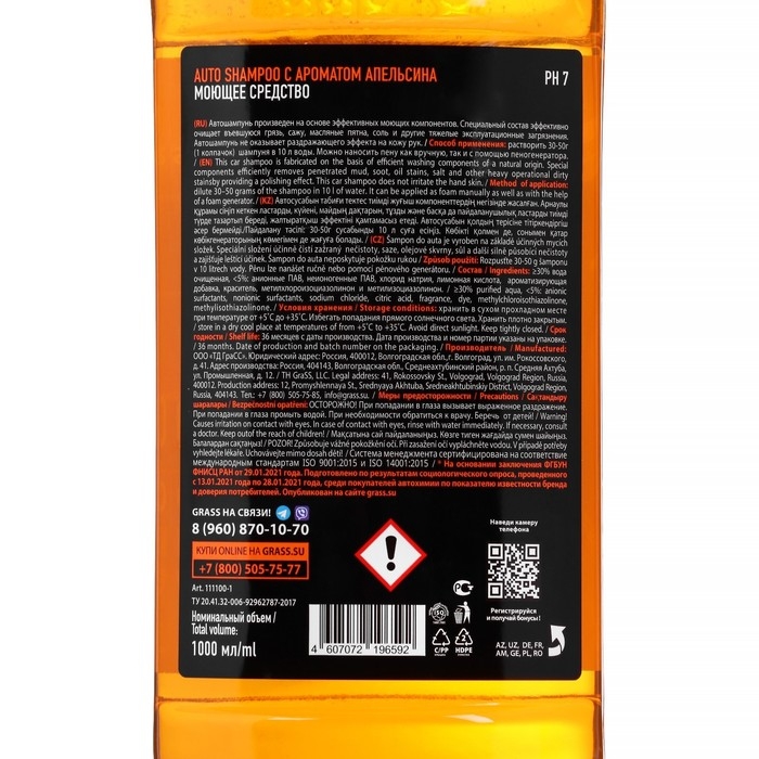 Автошампунь Grass Universal, апельсин, 1 л, контактный