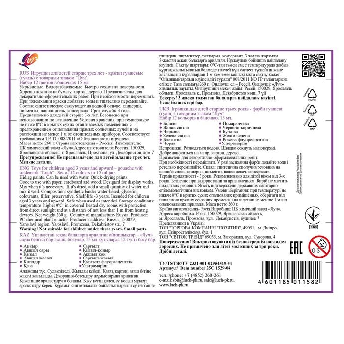 Полупрофессиональная краска, предназначена для широкого круга покупателей: школьники, студенты, любители живописи. Усовершенствованная рецептура гуаши, использование безопасного современного связующего ставит краску на более высокий профессиональный уровень, чем классическая детская гуашь. Очень яркие, звонкие и чистые цвета, хорошо смешиваются, позволяя получать новые чистые цвета и оттенки. Краска моментально высыхает, абсолютно не теряя цвета и насыщенности. Очень красивая подборка цветов. Оптимальная консистенция и однородность (краска не жидкая и не загустевшая, не засохшая). Гуашь имеет отличную укрывистость. Гуашь легко смывается с рук и одежды. Не имеет неприятного запаха. Абсолютно безопасна для детского творчества.