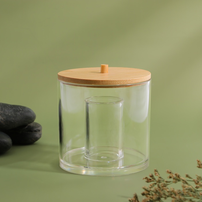 Органайзер для хранения ватных палочек «BAMBOO», с крышкой, d = 9,5 × 9,7 см, в картонной коробке, цвет прозрачный/коричневый