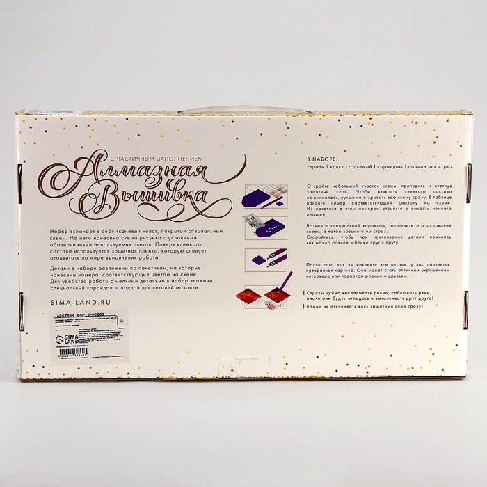 Часть изображения предстоит заполнить стразами, другая часть напечатана на холсте-основе. Поэтому набор подойдёт для тех, кто впервые пробует свои силы в этой технике или любит быстро добиваться результата.