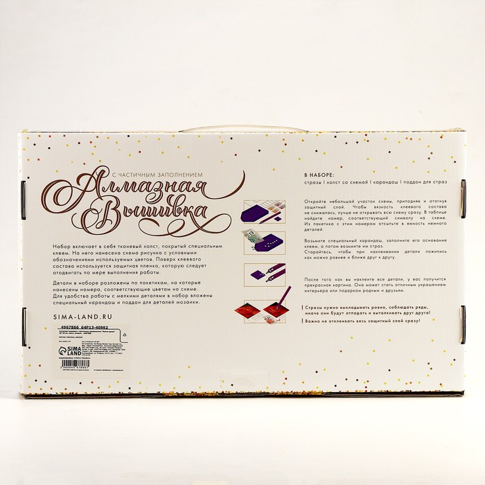 Часть изображения предстоит заполнить стразами, другая часть напечатана на холсте-основе. Поэтому набор подойдёт для тех, кто впервые пробует свои силы в этой технике или любит быстро добиваться результата.