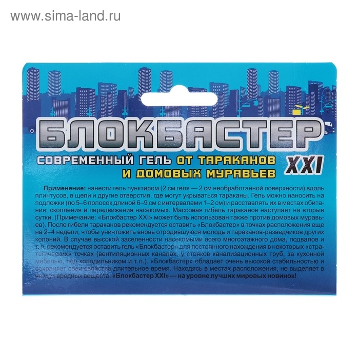 Можно ли полностью уничтожить тараканов, да еще без вреда для собственного здоровья? И чтобы при этом забыть о них на годы? Именно этому служит новый гель «Блокбастер XXI». Это современное, инновационное средство. Отличительное свойство этого геля в том, что он содержит в своем составе сразу два действующих вещества (тиаметоксам и альфа-циперметрин). Они усиливают действие друг друга и уничтожают даже самых устойчивых тараканов. Гель «Блокбастер XXI» уже через 2–3 дня полностью истребит всех тараканов в доме. Гель обладает «каскадным» эффектом: даже один отравленный таракан передает смертельную дозу яда своим сородичам в количестве до 50 штук. Входящие в его состав привлекатели заставляют тараканов предпочитать эту приманку любой другой пище. Гель «Блокбастер XXI» не портится, не высыхает и не теряет своей эффективности очень долгое время. Гель удобен в применении, легко наносится в труднодоступные места. Не имеет неприятного запаха, не выделяет в воздух вредных веществ и может применяться людьми, страдающими аллергией или астмой. Входящая в его состав, горькая для млекопитающих добавка «битрекс» предотвращает случайное поедание геля домашними животными.