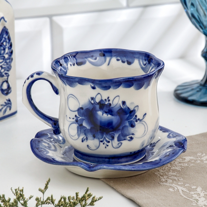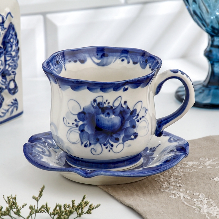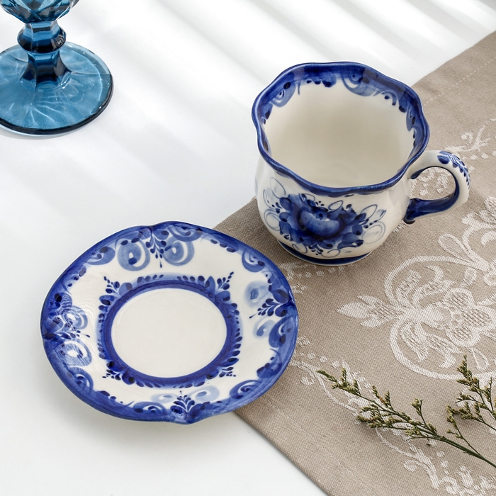 Набор чайный керамический Доляна «Русский узор», 4 предмета: 2 чашки 210 мл, 2 блюдца d=14,1 см, цвет синий