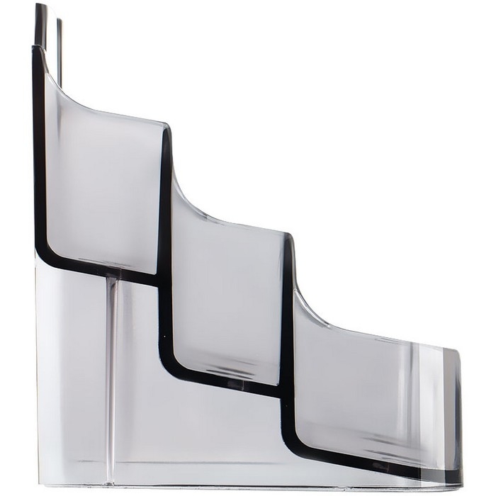 Подставка под визитки имеет 3 отделения, расположенных каскадом. Ширина отделений: 1 х 25 мм и 2 х 20 мм. Эргономичный дизайн, закругленные углы. Гладкая, полированная поверхность. Устойчивая, легкая, прочная.