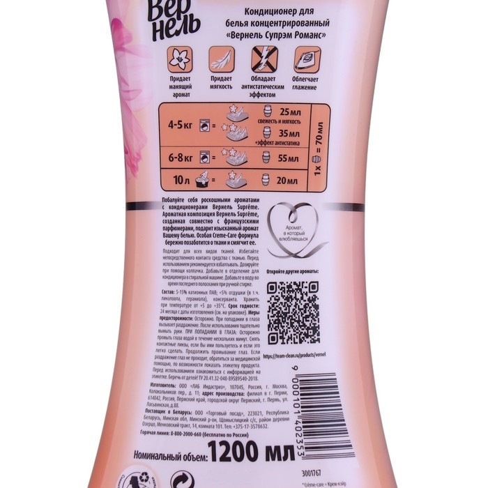 Концентрированный кондиционер для белья Вернель Супрэм Романс создан совместно с французскими парфюмерами и обладает элегантным сочетанием аромата роз, белых цветов и цитрусовых нот, которые придадут изысканный аромат вашему белью. Кондционер для стирки содержит миллионы разглаживающих частиц для роскошной мягкости и заботе о ткани. Вместе с кондиционером для белья Вернель Супрэм Романс окутайте себя изысканным французским ароматом и перенеситесь в атмосферу Парижа.