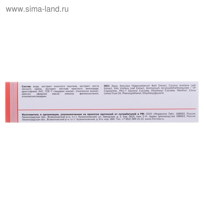 Состав: вода, экстракт конского каштана, экстракт листа лесного ореха, экстракт листьев красного винограда, аристофлекс AVC, ПЭГ-7 глицерил кокоат, этилгексил кокоат, ментол, эфирное масло лимона, феноксиэтанол, этилгексилглицерин.