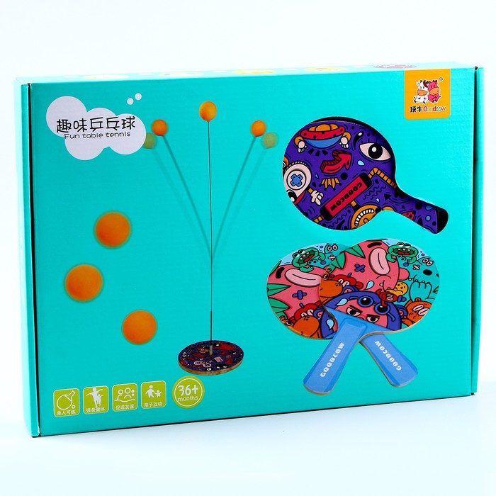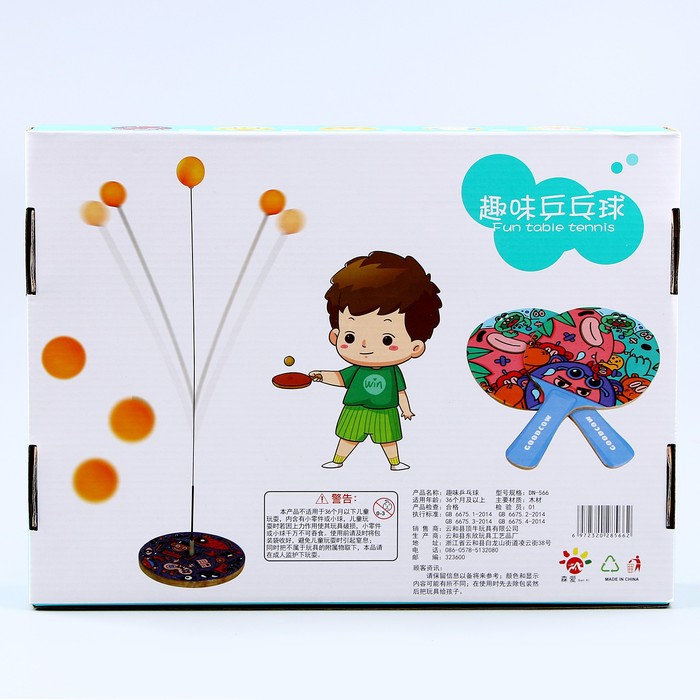 В комплекте: деревянная основа, гибкий штырь для шарика (может гнуться без деформации до 180 градусов), 2 ракетки, 3 шарика для пинг-понга.