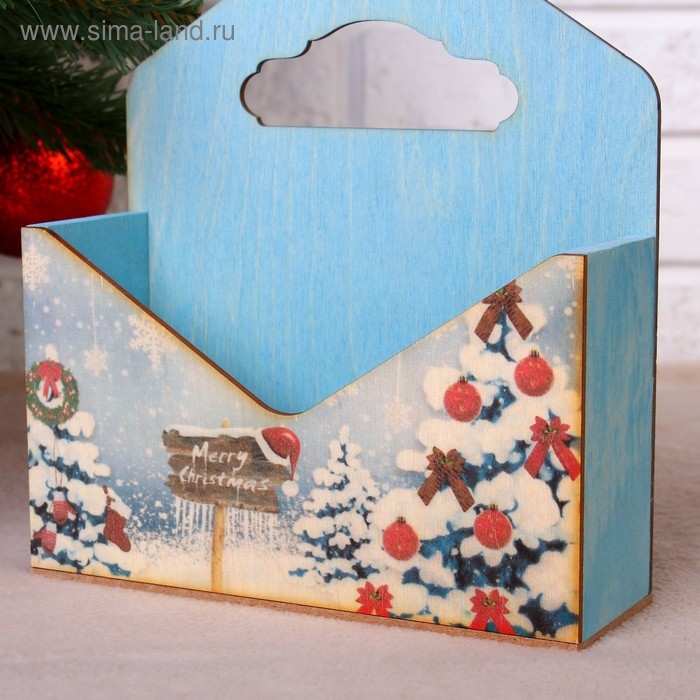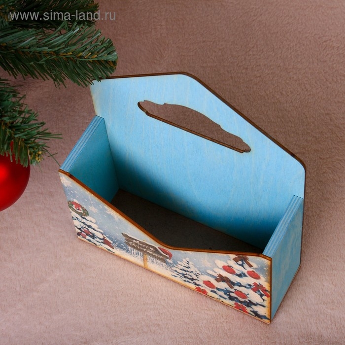 Кашпо деревянное "Конверт, Новогодний №1", деревянная ручка, голубое, 20,5×18×6 см