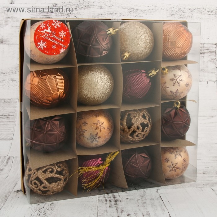 Ёлочные игрушки, шары новогодние , пластик, набор d-6 см, 16 шт "Винтажный узор" кофейный МИКС