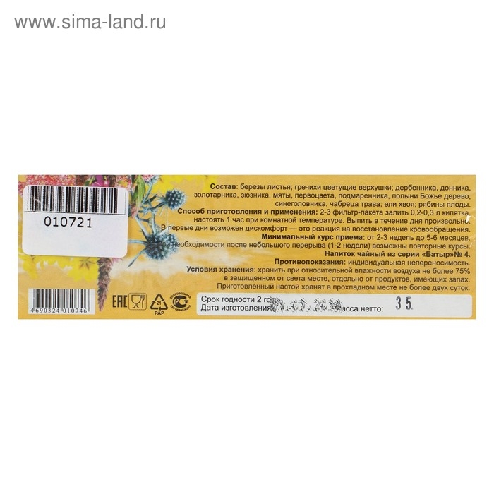 Состав: березы листья, гречихи цветущие верхушки, дербенника, донника, золотарника, зюзника, мяты, первоцвета, подмаренника, полыни Божье дерево, синеголовника, чабреца трава, ели хвоя, рябины плоды.
