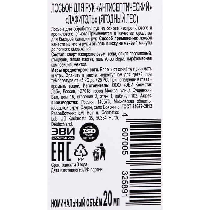 Антисептик для рук Lafitel "Ягодный лес", лосьон, 20 мл
