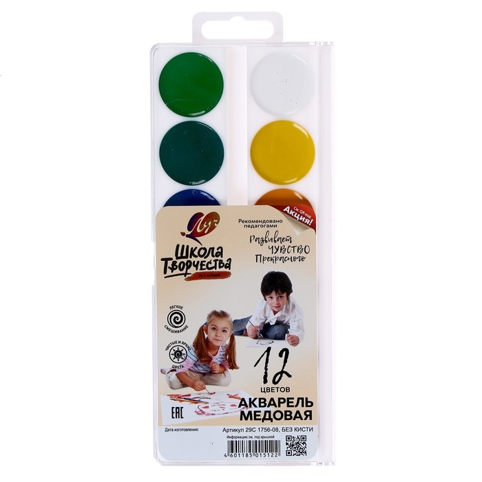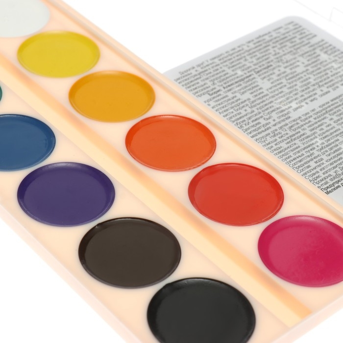 Медовая акварель изготовленная по классической рецептуре с яркими и чистыми цветами. Краска в подложке расположена группами: холодные-тёплые оттенки. Прекрасно размывается и разносится по поверхности бумаги, имея прозрачную основу без вкраплений. Краски смешиваются между собой, сохраняя насыщенность цвета. Краска легко смывается с рук и одежды.