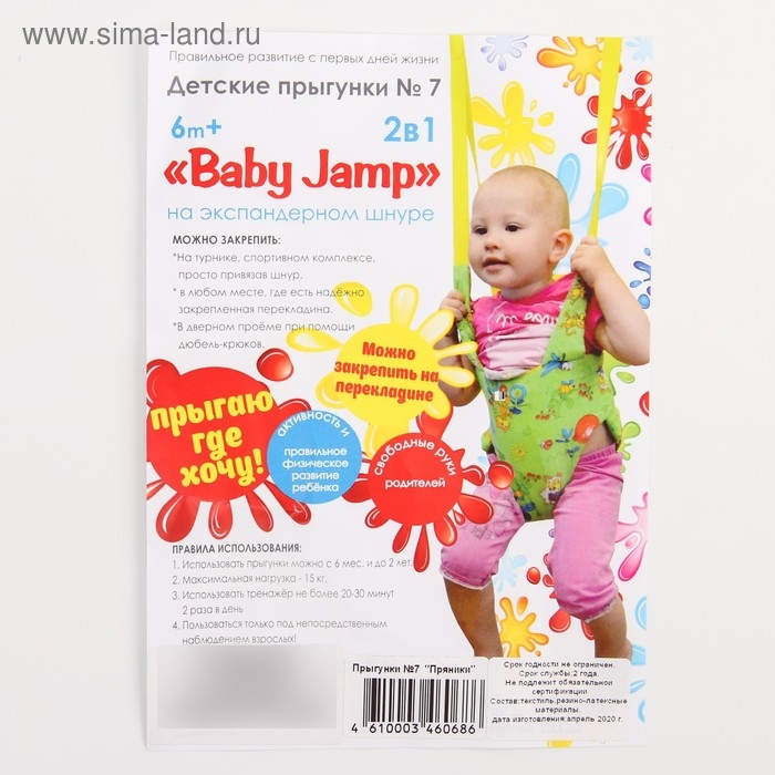 Посадите полугодовалого кроху в сиденье-штанишки. Малышу понравится активная игра, он будет подпрыгивать и качаться. Размер посадочного места можно настроить индивидуально, а за перекладину ребёнку будет удобно держаться.