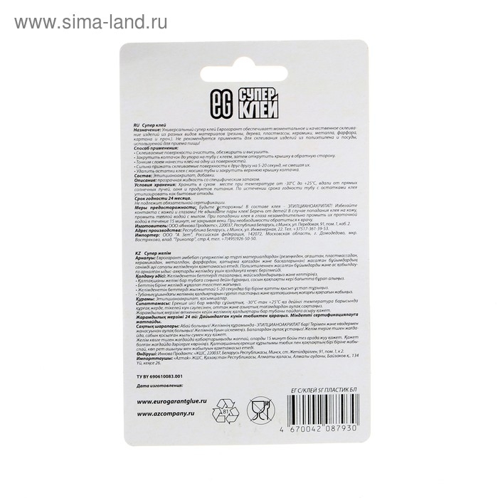 Клей EG Еврогарант секундный обладает всеми соответствующими сертификатами, изделия полностью соответствуют международным и российским государственным стандартам.