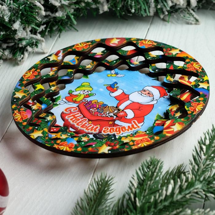 Тарелка сувенирная деревянная "Новогодний. Дед Мороз, подарки лесу", цветной