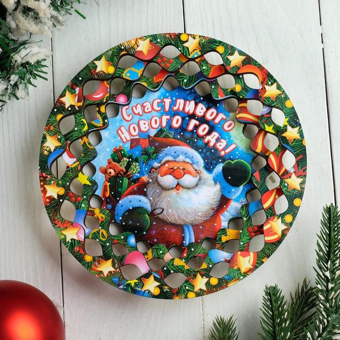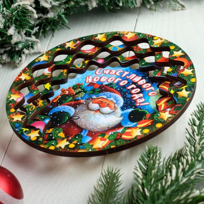 Тарелка сувенирная деревянная "Новогодний. Дед Мороз спешит на санях", цветной