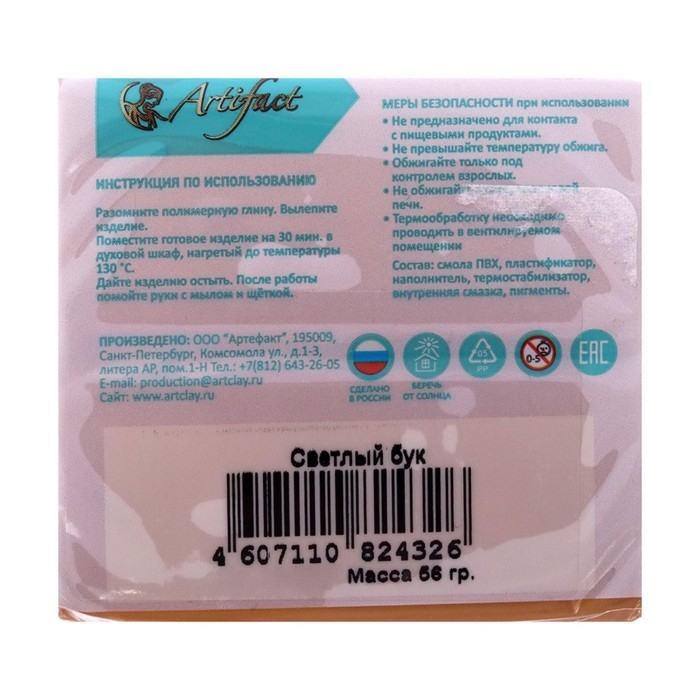 Artifact — первый в России производитель полимерной глины, который выпускает качественные и безопасные материалы для лепки и моделирования.Полимерная глина Artifact — это оптимальный вариант для того, чтобы познакомиться с материалом и сделать первый шедевр. Цвет не меняется после запекания. Легко смешивается с другими для получения ярких оттенков.По внешнему виду и своей податливости полимерная глина похожа на пластилин, а после запекания превращается в твёрдую пластмассу. С её помощью можно изготовить мельчайшие детали. Работать с полимерной глиной легко: изделие нужно только слепить и запечь.Обожжённые поделки хранятся длительное время. Готовые изделия можно мыть и протирать влажной салфеткой. Состав полимерной глины подобран таким образом, чтобы при хранении она не твердела, при лепке не крошилась и не пачкалась, а после запекания не ломалась. Материал безопасен, с ним может работать даже ребёнок.Подходит для профессионального использования. Рекомендовано для детей от 5 лет.