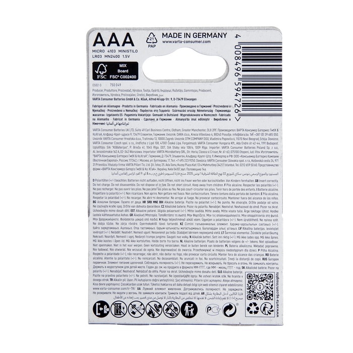 Батарейка алкалиновая Varta LongLife, AAA, LR03-2BL, 1.5В, блистер, 2 шт.