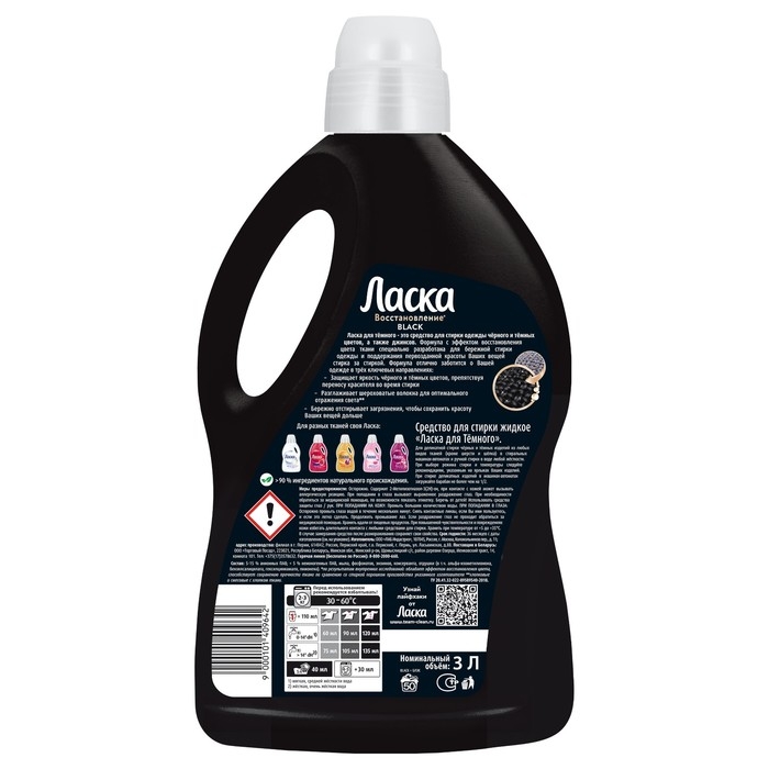 Жидкий порошок Ласка Восстановление BLACK для тёмного эффективно и бережно отстирывает загрязнения на одежде, восстанавливая яркость чёрного и тёмных цветов и сохраняя прочность волокон ткани. В отличие от обычного порошка, Ласка содержит цветозащитные ингредиенты, которые поддерживают стойкость цвета одежды. Активные компоненты способствуют уменьшению количества катышков на ткани. Формула содержит более 90% ингредиентов натурального происхождения.