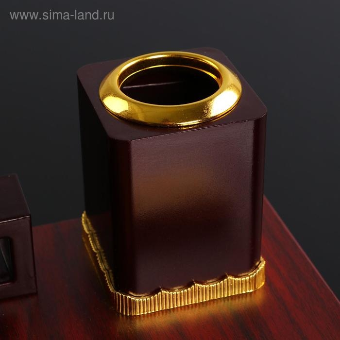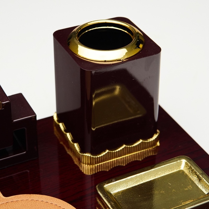 Компактный настольный набор поможет избежать хаоса на рабочем месте. Храните в нём канцелярские принадлежности или другие мелочи, чтобы правильно организовать пространство. К тому же изделие имеет минималистичный дизайн и выполнено под дерево, поэтому оно украсит собой любое место как декоративный элемент.