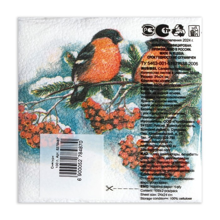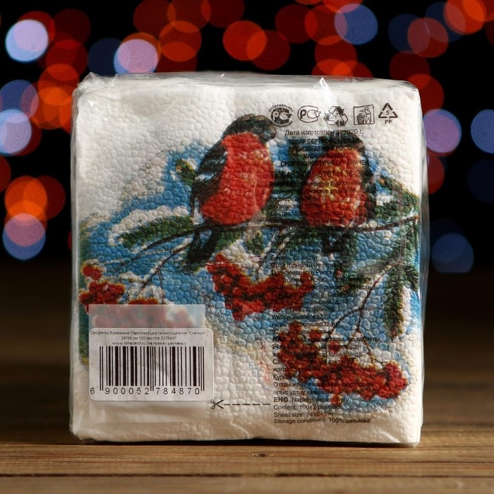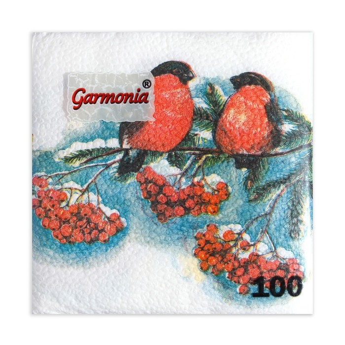Новогодние салфетки бумажные Гармония цвета «Снегири», 24х24 см, 100 шт