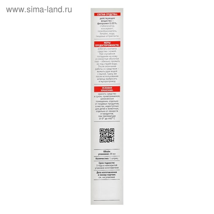Инсектецидное средство в форме геля в шприце защитит ваш дом и избавит от всех видов тараканов и рыжих домовых муравьёв.Способ применения: гель наносят пунктиром на поверхности или размещают на подложках в местах появления насекомых. Гибелль тараканов наступает на 2-3 сутки, муравьёв - через 1 сутки. Повторное применение рекомендуется при появлении насекомых, но не ранее чем через 4 недели, т.к. средство обладая кишечно-контактным действием, сохраняет свою эффективность в течение 1,5-2 месяцев.Состав: фипронил 0,05%, стабилизатор, консервант, гелеобразователь, битрекс, вода, пищевые аттрактанты.