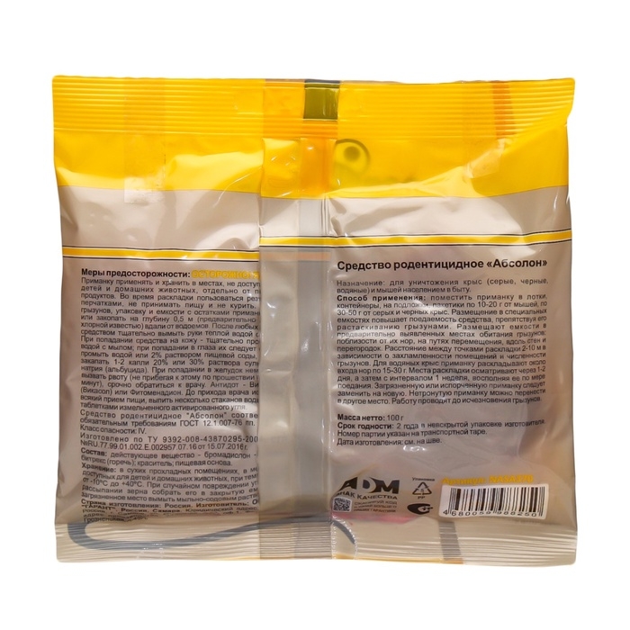 Универсальная приманка для уничтожения мышей и крыс. Основу составляет измельченное зерно, введенное вместе с Активным действующим веществом в расплавленный парафин и сформированных в форме небольших брикетов оригинальной формы, удобных для поедания, как крысами, так и мышами.