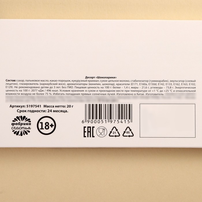 Состав: сахар, пальмовое масло, какао-порошок, кукурузный крахмал, сухое цельное молоко, стабилизатор (гуммиарабик), эмульгатор (соевый лецитин), глазирователь (карнаубский воск), ароматизаторы (ванилин, шоколад), красители (Е171, Е160а, Е150d, Е142, Е133, Е162, Е163, Е102, Е129).