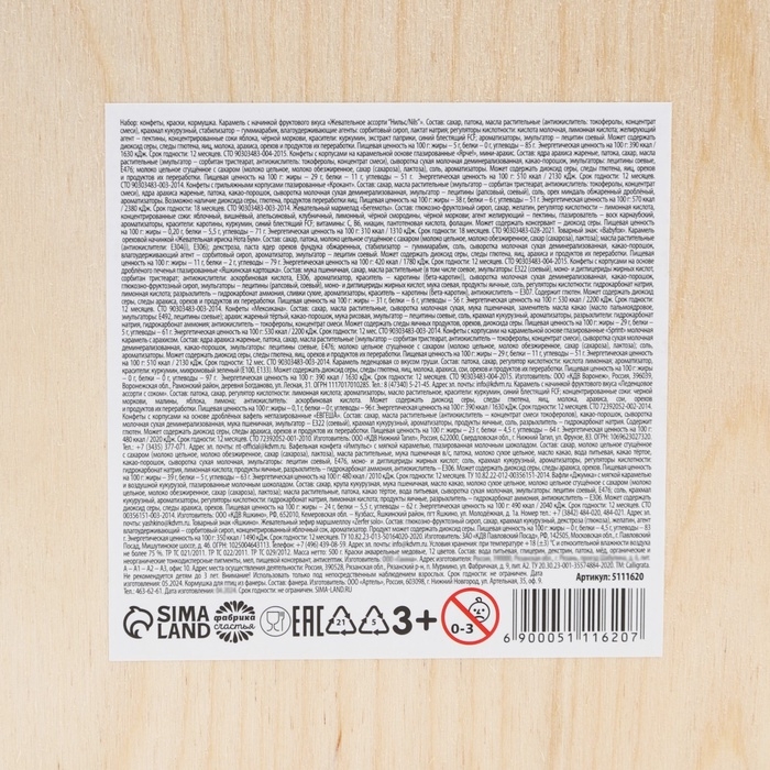 Состав: патока, сахар, регулятор кислотности: лимонная кислота; ароматизаторы, масло растительное, красители: куркумин, синий блестящий FCF; концентрированные соки: черной моркови, малины, яблока, лимона; антиокислитель: аскорбиновая кислота. Может содержать диоксид серы, следы глютена, яиц, молока, арахиса, сои, орехов и продуктов их переработки.