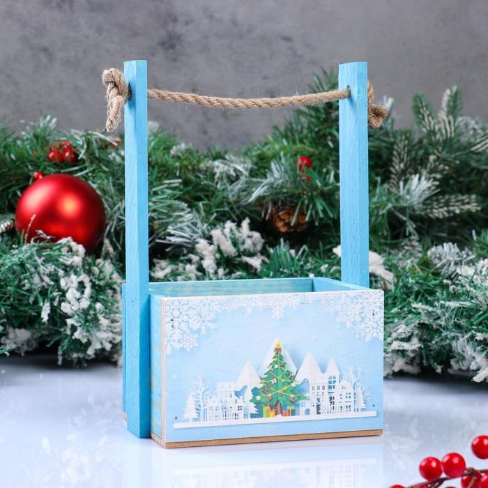 Кашпо деревянное, 15×12×8.5(25) см "Пауль и Любовь. Новогоднее, Снежинки, ёлочки", с принтом