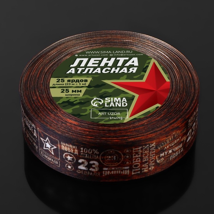 Лента атласная «23 февраля», 25 мм × 23 ± 1 м, цвет коричневый