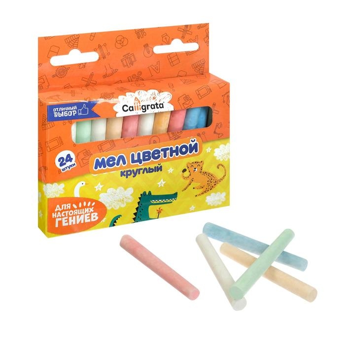 Мел школьный цветной 24 шт (6 цветов х 4), круглый беспыльный, в картонной коробке