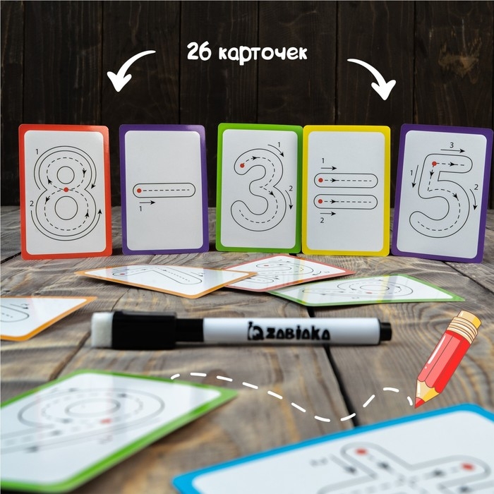 На этих волшебных карточках можно писать маркером и стирать много раз благодаря специальному покрытию. Игра способствует развитию логики, моторики и внимания.