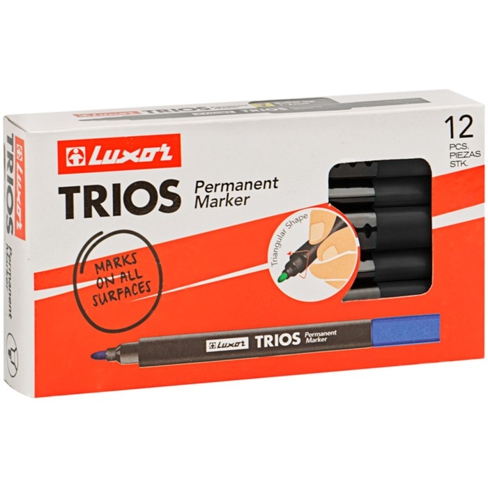 Эргономичный перманентный маркер Luxor "Trios" - универсальное решение для маркировки на всех типах поверхностей: металл, дерево, резина, бетон, камень, кирпич, стекло, пленка, картон.